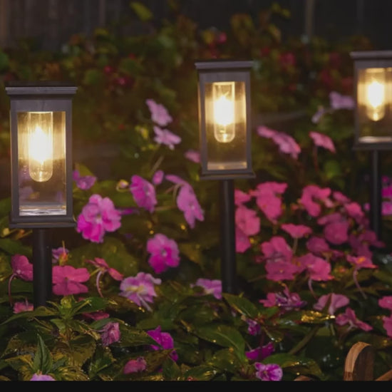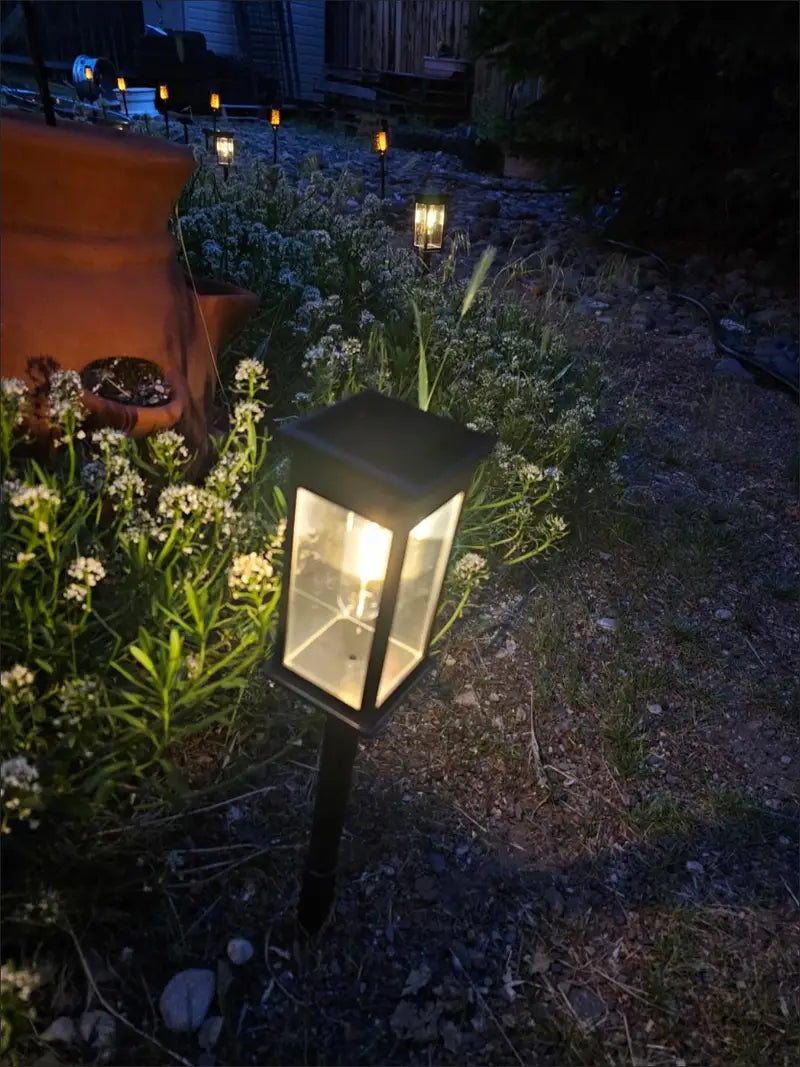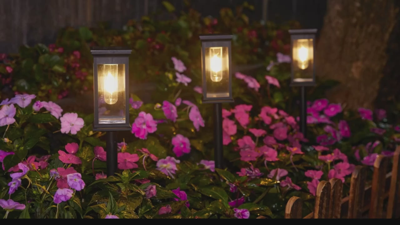 The outdoor solar lights adopt a unique rectangular transparent appearance design with adjustable height that greatly meets your different lighting and decoration needs. Solar pathway lights use upgraded filament LED that appear brighter, which creates a romantic atmosphere. The pattern of solar lights outdoor waterproof is also attractive and enhances your yard's class and home value. Solar lights outdoor are the perfect addition to your backyard!